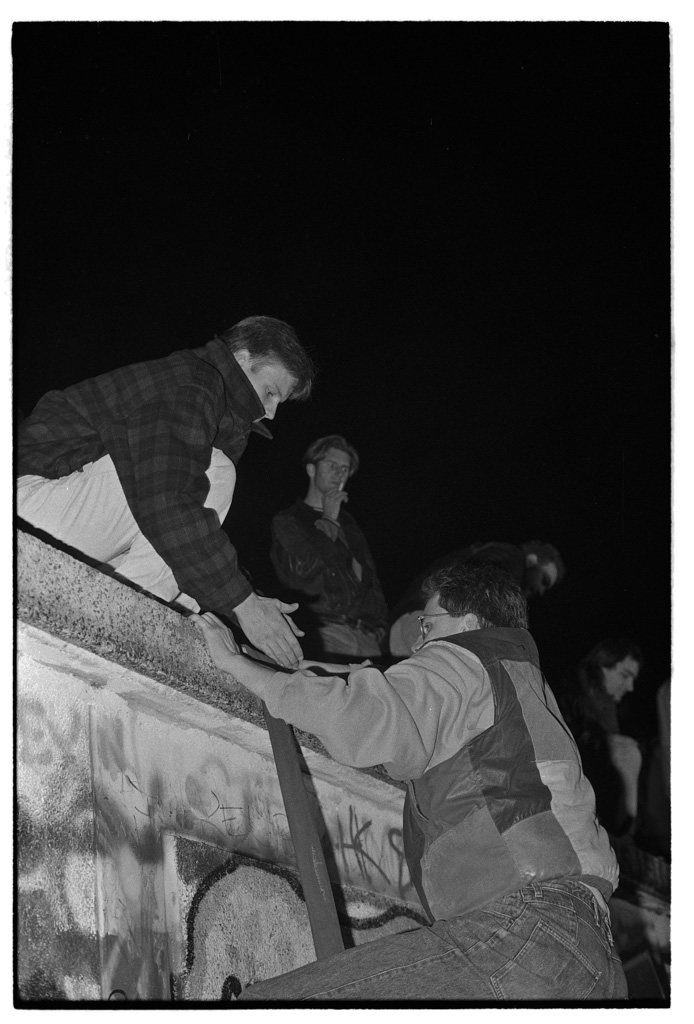 Mittlerweile haben viele Menschen die in diesem Abschnitt verbreiterte Mauer erklommen und die besonnenen Vopos bilden eine lange Kette, um den Run über die Mauer zu verhindern. Sie haben schlichtweg Sorge, dass unter der wachsenden Menschenmenge auf der Mauer etwas einstürzt oder dass es Verletzte durch Stürze gibt. Freundlich bittet mich ein älterer Polizist, auch nicht durch das Tor zurückzugehen, sondern den Übergang Invalidenstraße zu nutzen: "Wenn de aus'm ersten Stock aus'm Fenster springst, denn musste och durche Tür wieda rinn!" Invalidenstraße sollte bereits geöffnet sein, informiert er mich noch, dann zieht er seinen Mantelkragen zusammen und vergräbt seine Hände wieder in den warmen Taschen. Sein Atem mischt sich mit dem Dunst der kalten Nacht. Ich mache mein einziges Foto von der Totalen und suche mir den Weg durch das dunkle, unbekannte Ostberlin zur Invalidenstraße.