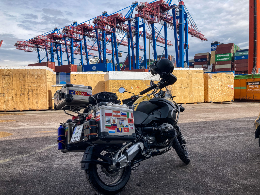 Und heute geht's nach Hamburg. Im Gepäck ist alles, was ich erst in Südamerika brauche und was ich nicht durch Neuseeland mitschleppen möchte. Die Fahrt in die Hansestadt dauert keine zwei Stunden, die richtige Adresse im riesigen Hamburger Hafen finde ich schnell. Alles ist unglaublich groß und gewaltig. Ozeanriesen werden durch die Hafenbecken gezogen, Portalkräne überall, Straddle Carrier, Reach Stacker mit Hubkräften von 50 Tonnen eilen durch enge Lagergassen und verteilen Container als seien es Streichholzschachteln. In einer bescheidenen Ecke einer Lagerhalle stelle ich mein Motorrad in die Reihe der anderen Motorräder, die schon auf die Verschiffung warten. Fast durchweg Enduros, alle im Tiefschlaf, still und voller Erwartung dessen, was da kommen wird. Manche mit Aufklebern, die bedeuten, dass es nicht die erste Reise auf den südlichen Kontinent Amerikas ist. Ein netter Hafenarbeiter zeigt mir meinen Platz. Ich ziehe mich um, verstaue die Motorradklamotten samt Helm in einem großen Gepäcksack und ziehe die mitgebrachten Zivilklamotten an. Batterie abklemmen, Koffer- und Zündschlüssel mit Kabelbinder an den Lenker und alles gut verzurren. Das ist ein verdammt komisches Gefühl, die Karre samt Schlüssel einfach hier abzustellen. Als Gegenwert bekomme ich ein DIN A4 Dokument der Anlieferung: Motorrad, 1 Stück, unverpackt. HU Nummer, Datum, Zielhafen. Das war's. Ich mache noch ein paar Fotos, dann rede ich Bienchen liebevoll zu, dass alles gut gehen wird und wir uns in ein paar Wochen in Südamerika wiedersehen werden und eine tolle Reise zusammen machen werden. Das Gefühl bleibt komisch. Bei herrlichem Sonnenschein fahre ich für heute mit der Hafenfähre, der Bahn und vielen Gedanken im Kopf wieder nach Hause.