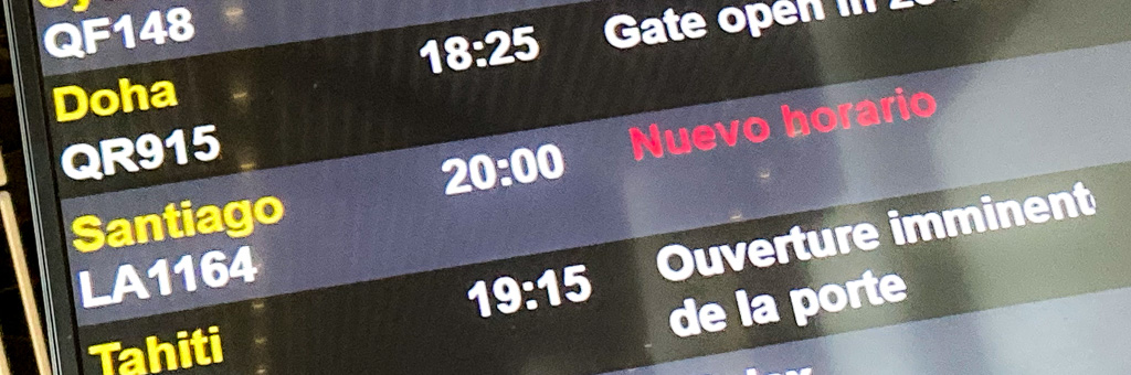 Ich suche mir eine stille Ecke mit Stromanschluss neben einer dieser Anzeigetafeln und fasse mal die letzten Tage in einem Reisebericht zusammen. Und denken wir mal positiv, ich muss ja auch noch ein Hotel in Santiago buchen. Dann ein Blick auf die Anzeige, hurra, da ist mein Flug! In Rot und zweisprachig: New time / Nuevo horario. Da meine bescheidene Mehrsprachigkeit beides versteht, ist die Kreuzdiagnose valide. Ich warte mit der Hotelbuchung besser noch etwas.
