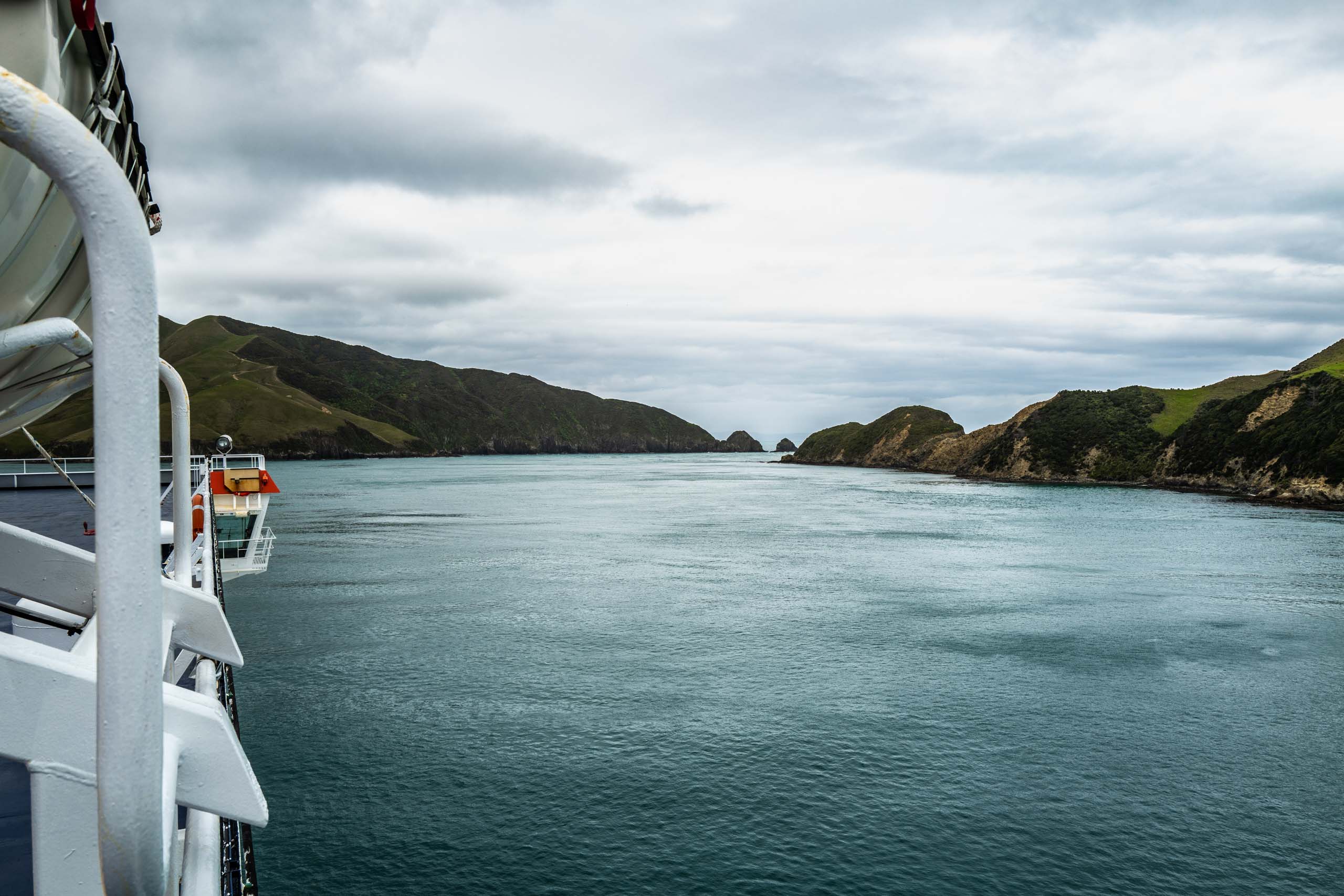 Der erste Teil der etwa dreieinhalbstündigen Überfahrt von Picton nach Wellington besteht aus einer langsamen Fahrt durch die verzweigte Insel- und Halbinselwelt des Marlborough Sounds. Außer ein paar (sehr) privilegierten Häusern gibt es in dieser unzugänglichen Gegend keine Siedlungen, viele Inseln sind sogar völlig unbewohnt. Bis wir auf die offene See hinausfahren genieße ich vom Oberdeck trotz heftigen Windes und Kälte diese einzigartige Landschaft, die der Mensch sich noch nicht Untertan gemacht hat. Dann wird es mir zu heftig und ich verbringe die restliche Fahrt gemütlich unter Deck. Die Einfahrt nach Wellington, das jetzt auch keine wirkliche Metropole ist, ist eine langsame Wiederannäherung an Zivilisation. Seit vier Wochen habe ich keine „Skyline“ mehr gesehen.