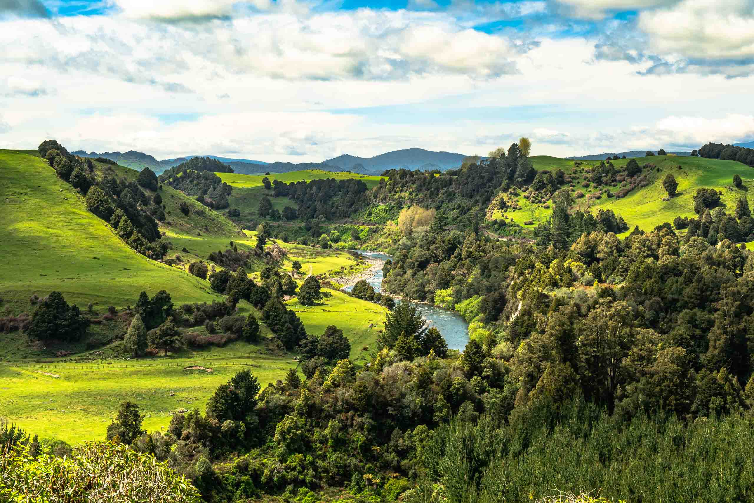 Noch lange sehe ich die schneebedeckten Gipfel von Tongariro im Rückspiegel. Die Fahrt führt mich ein Stück durch langweilige Gegend bis Taumarunui, dann biege ich links ab auf den Highway 43, „The Highway of the Forgotten World“. Die gewundene, weltberühmte Straße entlang des Tangarakau Rivers ist etwas ganz besonderes. Die Landschaft wirkt tatsächlich wie „vergessen“, es gibt kaum Häuser oder größere Siedlungen, an den steilen Hängen weiden Schafe und Rinder und in Whangamomona scheint die Zeit stehengeblieben zu sein. Hier hat man eine eigene Republik ausgerufen. Den Einreisestempel kann man im Hotel des gleichnamigen Ortes bekommen. Die abenteuerliche Eisenbahnlinie, die schon längst außer Betrieb ist, begleitet mich den ganzen Weg. Die Schilder an den Bahnübergängen weisen nur noch auf gelegentlichen Draisinenverkehr hin. Irgendwann endet der Asphalt, ich fahre ab hier Schotterpiste durch das Tangarakautal und den Tangarakau Gorge selbst. Weiter oben muss ich durch den Moki Tunnel. Einspurig und noch durchfahrbar mit meinem Camper. Dieser Tunnel wurde von Hand gehauen und ist heute immer noch die einzige Verbindung der beiden angrenzenden Täler und das Nadelöhr des ganzen Highways 43. Über drei Pässe klettert die Bergstraße. Den Tahore, den Whangamomona und den Pohokura Sattel. Das unglaublich intensive Grün an den Hängen veranlasst mich, oft stehenzubleiben. Das sieht aus, als ob jemand eine gigantische Buckelpiste mit grüner Auslegeware beschichtet hat. Nur schöner.