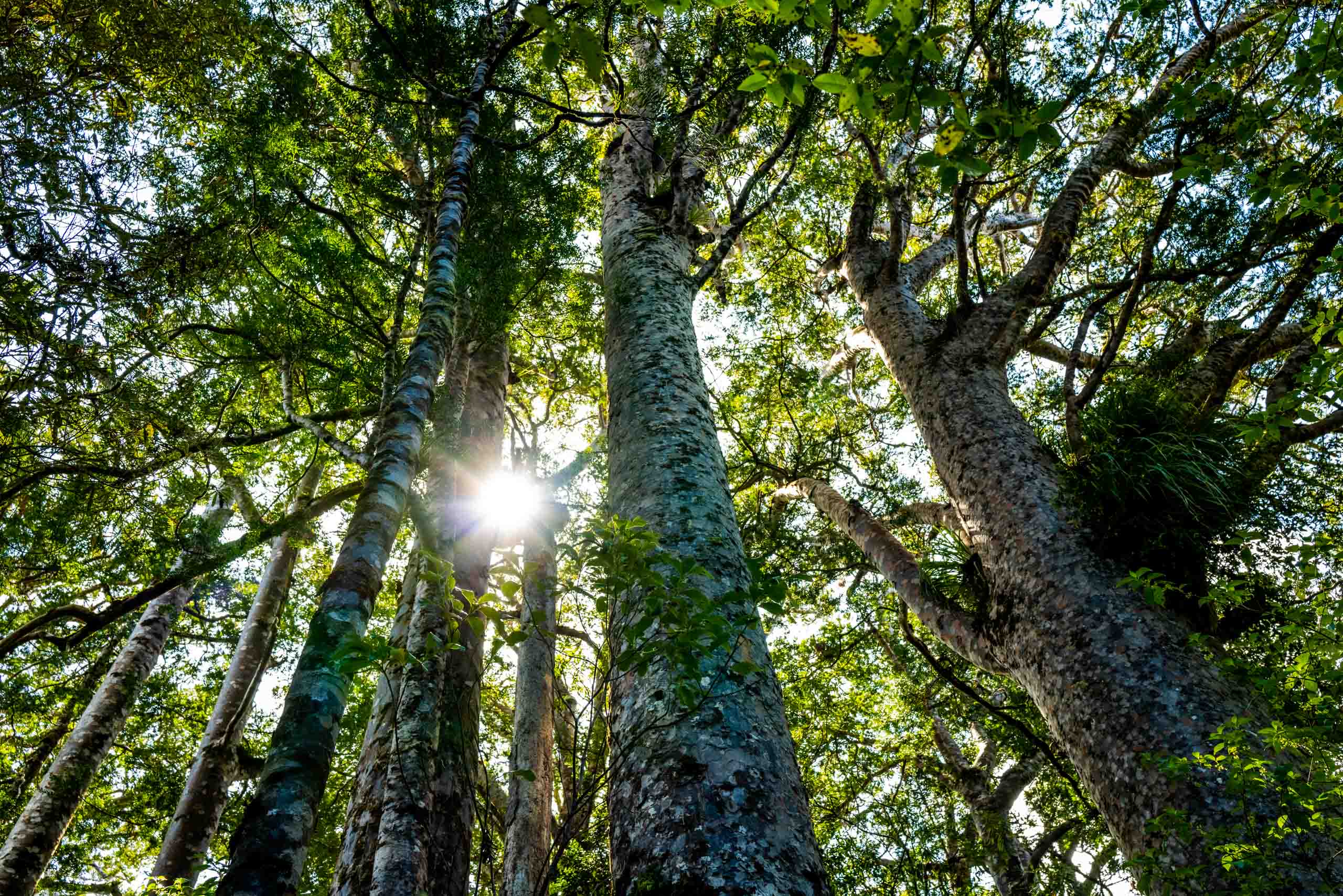 Trotz dieser ernsten und tragischen Situation zugleich möchte ich aber die Faszination, die diese Riesenbäume auslösen, nicht zu kurz kommen lassen. In den Wäldern stehen abertausende von Kauri. Nicht alle sind Baumriesen und auch nicht jeder Kauri schafft es bis zu einer Höhe über 50 Meter wie der Tane Mahuta. Jedoch sind sie alle sehr hoch und leben wie die meisten großen Pflanzen in Symbiose oder Vergesellschaftung mit den unterschiedlichen Zeitgenossen. Das spannende ist in diesem dichten Regenwald, dass man die Riesen-Kauri nicht sieht, bevor man ihnen nicht sehr nahe gekommen ist. Dieses grüne Dickicht ist wörtlich undurchschaubar. Und dann steht man vor einem dieser Giganten und das Staunen nimmt kein Ende. Wie schon oben beim Cookson Kauri beschrieben, erscheint die Rinde sehr glatt und gleichmäßig. Die Stämme sind oft perfekt rund und stehen lotrecht. Erst sehr viel weiter oben verzweigen sie sich und schaffen die Grundlage für ganze Ökosysteme in ihrer mächtigen Krone. Hier ein kleiner Eindruck, von welchen Größenordnungen ich spreche. Das ist der zweitgrößte Kauri Neuseelands, der „Te Matua Ngahere“ (Father of the Forest).