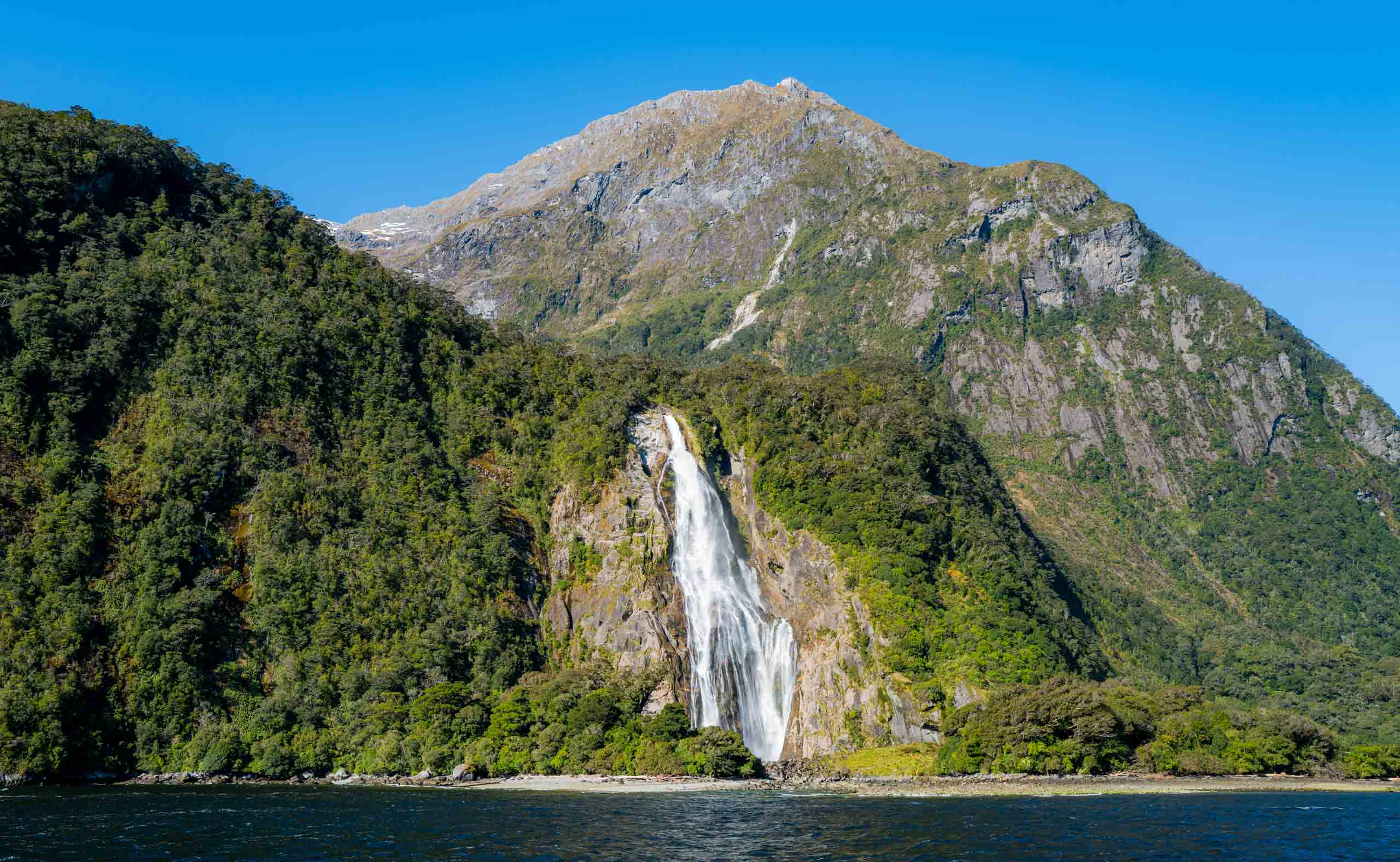 Halstuch um, Jacke zu, Hände in die Taschen. So ist es toll vorne auf dem Vorschiff hinaus in den Fjord. Rechts und links erheben sich monumentale Wände aus Stein in hunderte Meter Höhe. Die Wasserfälle zähle ich nicht mehr, große Kaskaden und kleine Rinnsale stürzen hier zu hunderten in den Fjord. Manche erreichen nie das Wasser, weil sie vom Wind einfach zerblasen werden. Die Vegetation lässt keinen Quadratmeter aus, ihr üppiges Grün zu verbreiten, mögen die Wände auch senkrecht sein, die Natur schafft das. Alles ist grün. Wir erreichen das offene Meer, Delfine umkreisen unser Schiff und beeindrucken uns mit ihren Schwimmkünsten. Unser weitester Punkt ist erreicht. Auf dem Rückweg besuchen wir noch eine kleine Bucht, die Pinguinen ein gefälliger Rückzugsort ist. Ein Wasserfall mit Duscheinlage und Regenbogen, dann endet die wunderbare Fahrt nach über zwei Stunden.