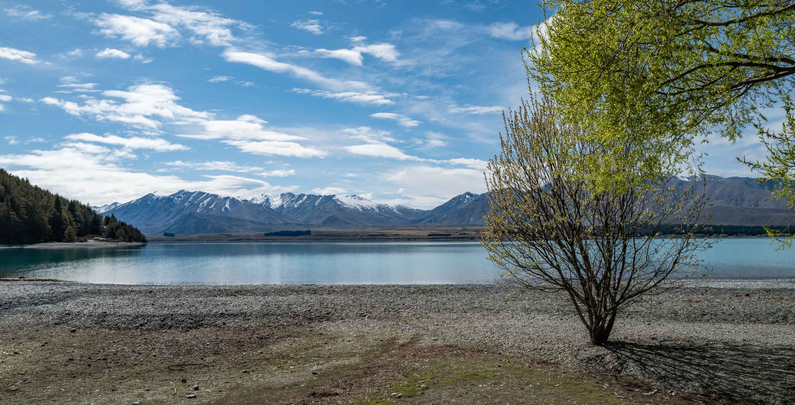 Der Lake Pukaki ist nochmal ein Highlight, bei der Windstille heute bietet er eine einzigartige Spiegelung der Berge im Wasser. Ganz im Norden ist der Aoraki – der Mont Cook – zu erkennen. Rechts und links Mount Sealy und The Nuns Veil. Alle schneebedeckt, ich kann mich gar nicht sattsehen. Ein Stückchen weiter entscheidet sich das Menü für heute Abend, gleich neben der Straße ist eine Lachsfischerei, die frischen Lachs vom Feinsten anbietet. Die Entscheidung ist nicht schwer, ich kaufe ein kleines Stück kalt geräucherten Lachs „beetroot curd“. Nun ist es auch zum Lake Tekapo nicht mehr weit und die Sonne scheint noch, als ich mein Ziel erreiche. Der Campground liegt direkt am See und Platz ist in der Nebensaison reichlich.
