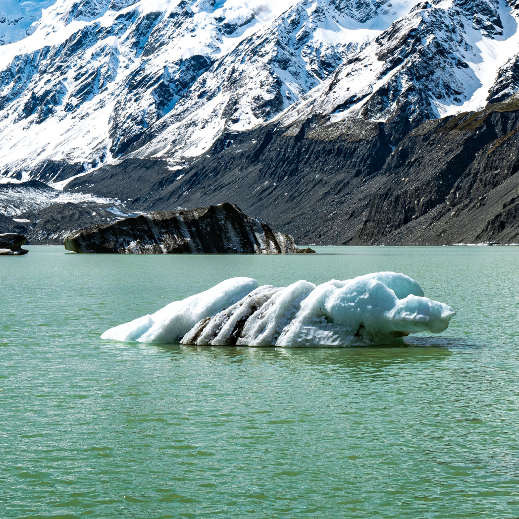 In Glentanner am Tasman River war es heute Nacht noch viel kälter, in dem Gletschertal geht das Thermometer diese Woche noch bis fast -10°C runter, will man der Vorhersage glauben. Und genau da will ich heute hin. Eiskalt! Schon die Fahrt dorthin ist wunderschön, die Sonne findet die ein oder andere Lücke durch die Wolken, das Licht wechselt auf den weißen Berghängen rechts und links. Am Lake Pukaki dann rechts nach Norden abbiegen, Richtung Mt. Cook. Jetzt ist die Straße komplett leer, rechts neben mir der türkise See, es ist nicht mehr weit bis zum einzigen Campground, zumindest mit Infrastruktur. Alles leer, Platz nach Wahl und preiswert. Fein, das wäre geregelt. Dann kann das Nachmittagsprogramm ja losgehen. Weiter geht's ins Tal zum Gletscher selbst. Das sind knappe dreißig Kilometer, dann ist Ende. Sackgasse am Tasman Glacier Viewpoint. Warme Klamotten an, Kamera, Mütze, Auto zu und los.