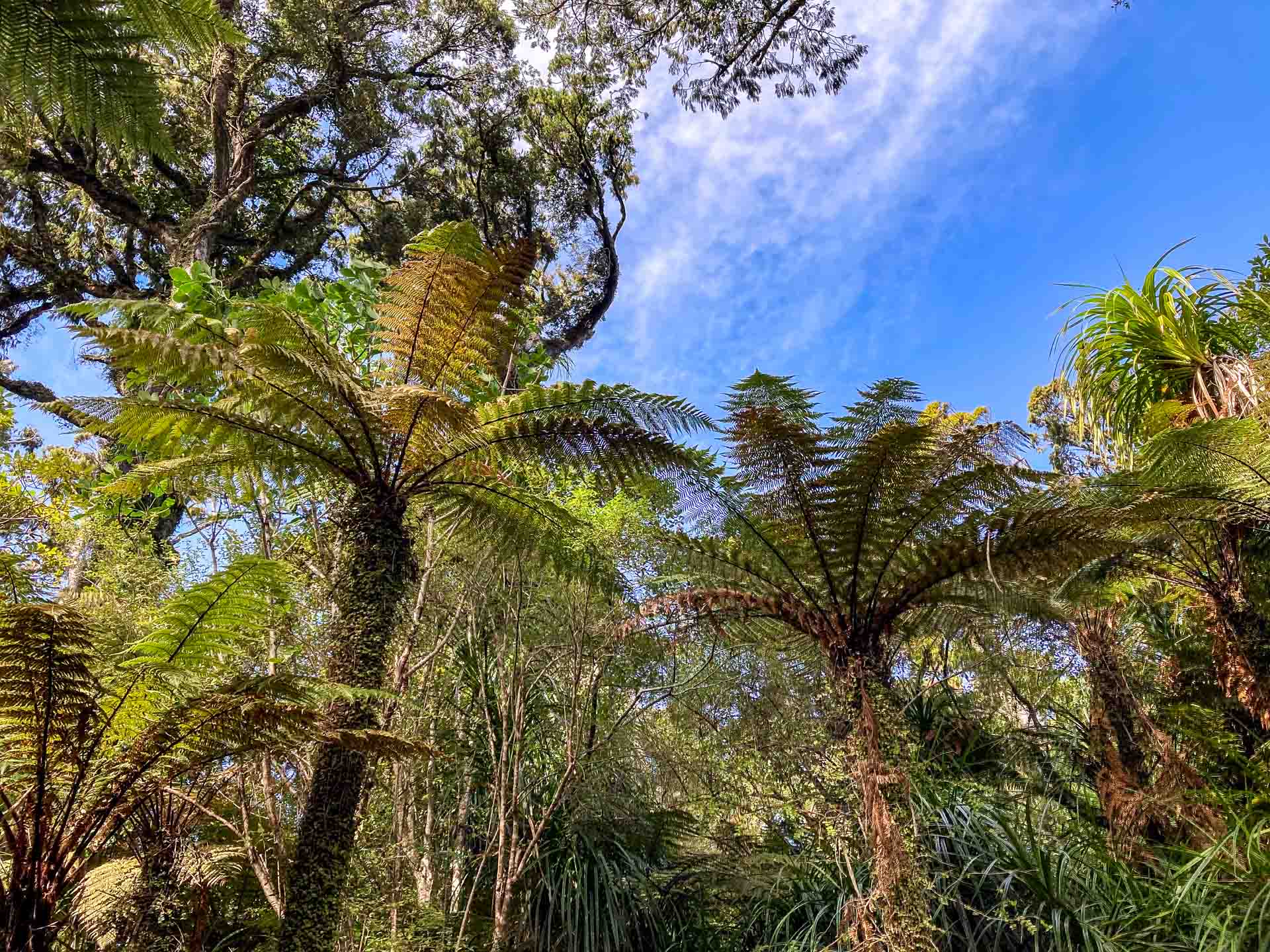 Dass Farne zu meinen Lieblingspflanzen gehören, habe ich ja schon öfter erzählt. Hier im Regenwald Neuseelands geht mir jedes Mal das Herz auf, wenn ich diese mit zu den ältesten Pflanzenarten der Welt gehörenden Farne sehe. Das sind lebende Fossilien, die vor 350 Millionen Jahren schon riesige Wälder bildeten. Über ihre fraktale Morphologie und das Mandelbrot’sche Prinzip der Selbstähnlichkeit habe ich schon an anderer Stelle berichtet. Sie sind fragil, wenn man Individuen anfasst, aber unverwüstlich, was ihre kollektive Vegetation angeht. Aus ihrer Mitte rollt sich ein Blatt aus. Aus diesem rollen sich wieder seitliche Blätter aus und daran wachsen kleine Laubblätter. Das Prinzip entspricht dem von Federn. Nein, das ist kein Zufall, dass diese „Bauart“ den Vogelfedern gleicht. Das ist Evolution.