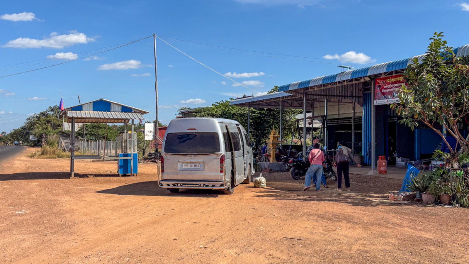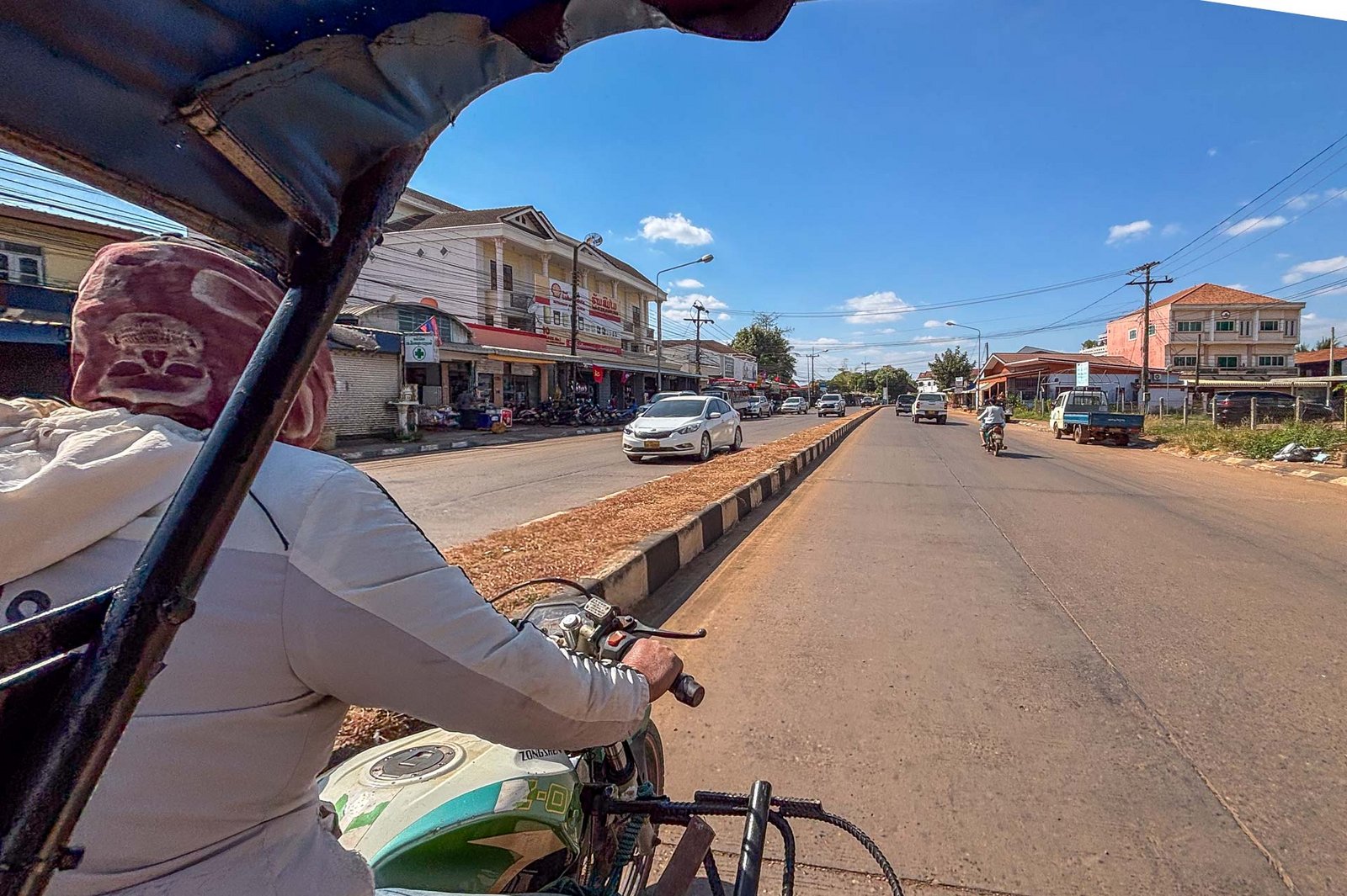 Als der Kleinbus einigermaßen gefüllt ist, übernimmt ein anderer Fahrer und es geht endlich los. Wir verlassen Siem Reap. Die Karre gibt derweil Geräusche von sich, die nicht darauf hindeuten, dass ich mein Ziel in Laos erreichen werde. Um es kurz zu machen, unser Fahrer telefoniert und chattet permanent während der Fahrt – offensichtlich akquiriert er weitere Fahrgäste. Wir fahren über staubige Nebenpisten und holen Menschen von zu Hause ab. Der Bus wird immer voller. Reissäcke, Obstsäcke, Koffer und Kisten werden geladen bis der letzte Stauraum voll ist. Die Fahrt endet an der laotischen Grenze am Nong Nok Khiene Border Checkpoint. Alle aussteigen und bitte mit Gepäck durch die Kontrollen laufen! Auf der anderen Seite stehe ein neuer Bus, heißt es. Ich bekomme irgendeinen Zettel in die Hand gedrückt und marschiere los. Wir müssen bei der Affenhitze den ganzen Grenzstreifen zu Fuß durchqueren, Autos fahren hier nicht. Das komplette Zeremoniell dauert etwa eine Stunde. Ausreise Kambodscha, alles wird mit buchhalterischer Akribie dokumentiert, dann weiterlatschen zur laotischen Seite und dort die gleiche Arie zwecks Einreise: Foto, Visum, Stempel, Datenerfassung – kostet 40 USD in bar und zwei Dollar Bearbeitungsgebühr – auch in bar! Ich bin in Laos! Und irgendwie finde ich in dem Chaos auch meinen Bus, der nach Pakse fährt. Einsteigen!