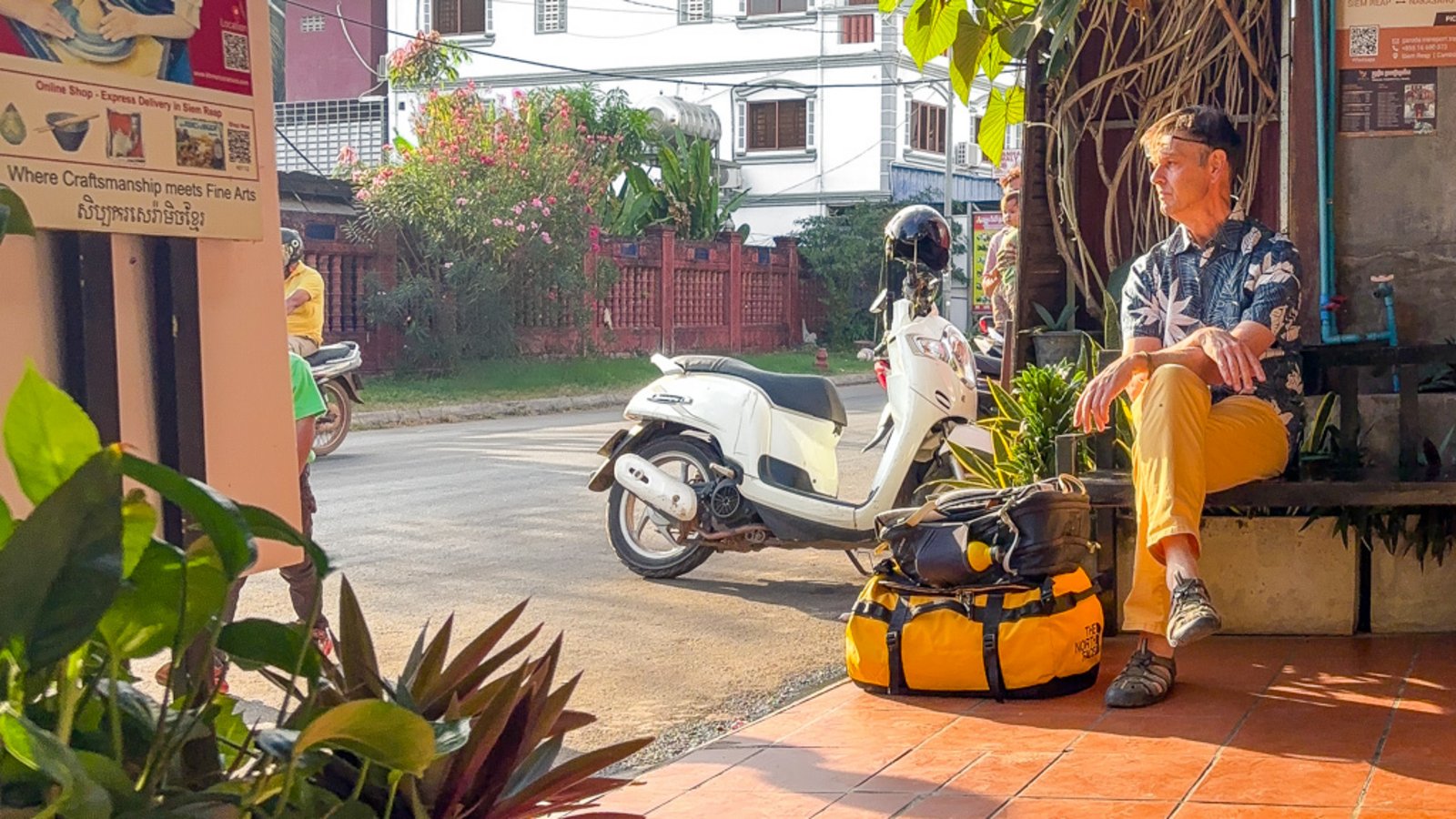 Wenigstens einen heißen Kaffee gibt es hier, nach Essen ist mir nicht zumute. Das Procedere ist das gleiche wie schon an den vergangenen Tagen, wir fahren pünktlich los und zockeln im zähfließenden Verkehr aus der großen Stadt. Mir geht’s immer noch nicht besser, der Bus ist nicht ganz so kalt wie beim letzten Mal, doch mich quälen kalte Schweißausbrüche und die ständige Wassertrinkerei verschafft mir eher Übelkeit als die Löschung dieses unsäglichen, brennenden Chili-Geschmacks. Regungslos starre ich aus dem Fenster und versuche nur die restlichen Stunden bis ans Ziel auszuhalten. Während der Mittagspause finde ich neben dem Restaurant eine kleine Hängematte, die mir ein bisschen Entspannung bringt, wenn auch nur für ein halbes Stündchen. Dann geht dasselbe Spielchen weiter. Nase rebelliert, kalter Schweiß und der Kreislauf kommt einfach nicht in die Gänge. Nach einer gefühlten Ewigkeit erreichen wir gegen 14:00 Uhr endlich den Busbahnhof in Siem Reap. Ich bin restlos fertig und will nur noch ins Hotel. Tuk-Tuk, einchecken und in Ruhe gelassen werden.